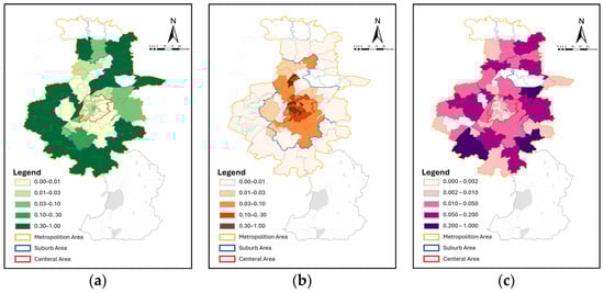 Supply level, demand level, and spatial equity index of urban park green spaces in each street unit of the main urban area of Nanjing. (a) Supply level; (b) demand level; (c) spatial equity index.