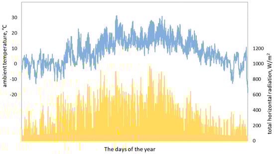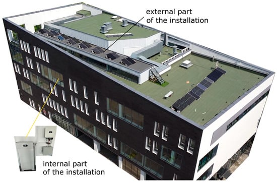 The research was conducted at an installation located at the Wrocław University of Science and Technology on the roof of building L1, belonging to the Laboratory of Renewable Energy. The installation consists of 16 different photovoltaic modules with a total capacity of 5 kWp connected to power optimizers, and then to a 5 kW hybrid inverter and a 15 kWh energy storage system. Figure 2 illustrates the climatic conditions prevailing in Wrocław using meteorological data for a Typical Meteorological Year for the local weather station. The chart was prepared based on ministerial data used for energy calculations of buildings [12].