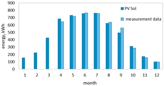 Due to the incomplete year of operation of the photovoltaic installation, data from the PV SOL Premium 2023 R3 software package were used for analysis. Presented below are the monthly production from the installation and the simulation results (Table 1 and Figure 5).