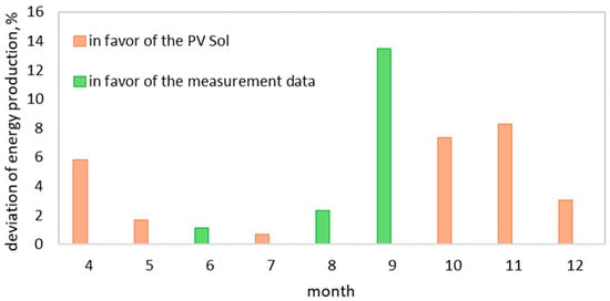 Analyzing the data reveals discrepancies between actual and projected values. Therefore, to validate the results, Equation (1) was used, which describes the deviation of energy production values obtained from the software in relation to the values obtained in the experiments: