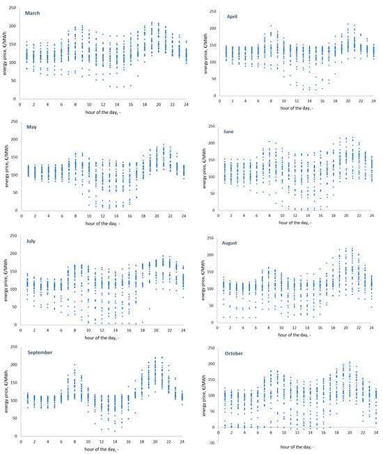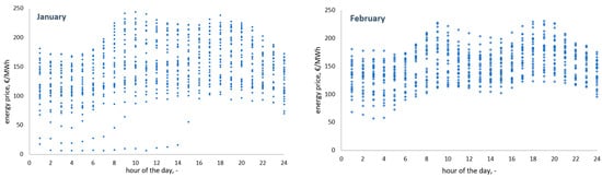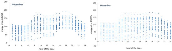 In the following charts (Figure 8), monthly energy prices at each hour of the day are presented. In all months, significant dynamics of changes within individual hours can be observed.