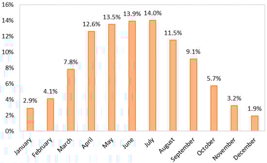 The lowest prices usually occur during nighttime and afternoon hours, while the highest values are observed in the morning and evening hours. This is particularly noticeable during the summer months. This period also corresponds to the highest efficiency of the PV installation. Statistically, production from April to September accounts for up to 70–75% of the annual yield. Figure 9 shows the share of energy yields from the research installation in individual months compared to the annual yield.