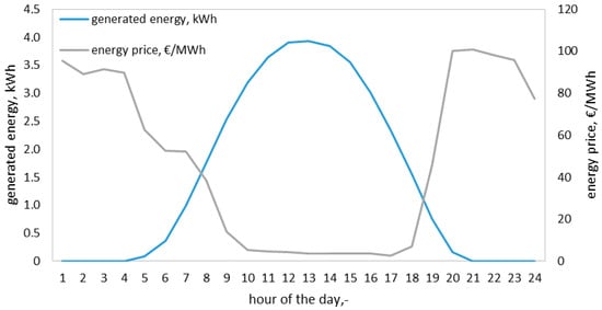 Figure 10 presents a comparison of hourly energy prices with the production profile from the research installation. The maximum production achieved during the afternoon hours coincides with the time when energy prices are among the lowest during the day.