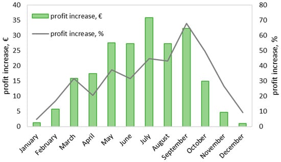 It is also worth analyzing the eight best months (from March to October—88% of annual production). During this period, the profit in the first scenario amounted to EUR 516.79, and in the second scenario EUR 715.43. The use of the energy storage system will increase the profit by EUR 198.64 (38.44%). This represents 93.95% of the total annual profit increase resulting from shifting sales to the evening hours. In the case of the four weakest months, due to minimal energy production and smaller price differentials throughout the day, the use of energy storage will bring only symbolic benefits amounting to EUR 12.79 (14.21%).
