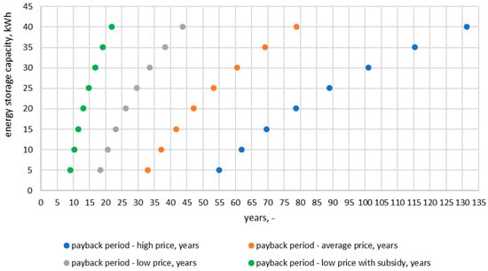 Given the development of the energy storage market in recent years, subsidy programs have been launched in Poland, which can significantly reduce the payback period of investments. Therefore, as the fourth variant, the price of the energy storage set with a 50% subsidy was adopted. The payback periods of the investment are shown in Figure 12.