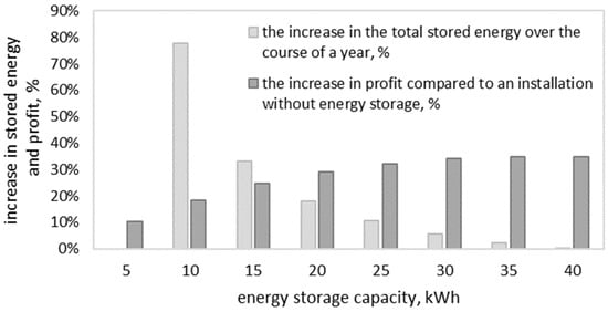 Assuming that the increase in the price of the energy storage system is linear and that with each increase in capacity, the price rises by 100% of the base price, for the energy storage system in the considered configuration to be profitable, the profit from using a device with greater capacity should also increase by at least 100%. This is not possible due to the insufficient yields of the considered 5 kWp research installation. Depending on the capacity of the storage system, the increase in the amount of stored energy and the increase in profit from sales compared to an installation without energy storage are shown in Figure 13.
