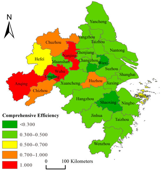 For instance, the comprehensive efficiency of Wuxi and Shaoxing hovered below 0.300, specifically at 0.280 and 0.252, respectively, falling short of the optimal efficiency benchmark by 30%. Shanghai, despite its prominence, also registered a relatively modest comprehensive efficiency score of 0.432, ranking 12th among the 27 cities (see Figure 3).