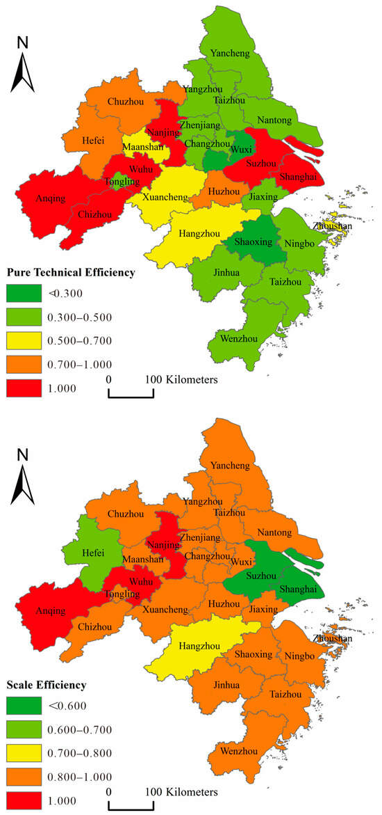 Secondly, pure technical efficiency emerges as a notable weakness among the 27 cities in the YRD, with most cities falling within the 30–50% range of optimal efficiency. In contrast, scale efficiency tends to outperform the average values of comprehensive and pure technical efficiency. However, Shanghai and Suzhou display the lowest scale efficiency among the cities.