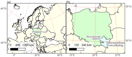 The study area was located in southeastern Poland, within the administrative limits of the Subcarpathian voivodeship. The Strzyżów district is situated at the boundary of two physico-geographical mesoregions. Its eastern part is located in the Strzyżów Foothills, whereas the western one extends into the Dynów Foothills. The region incorporates the Carpathian Flysch Belt. A characteristic feature of the area is the presence of hill ranges reaching up to 500 m above sea level, with the Wisłok River flowing in between them. The hills are covered with mosaic-like fields and forests [42,43].