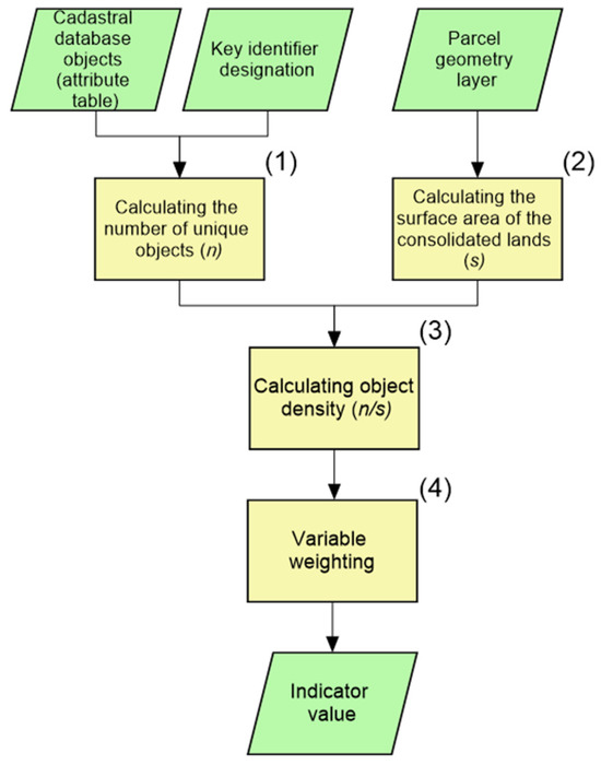 An extension to the customarily practiced methods of analysing cadastral data in the land consolidation context can be supplementary research involving factors calculated using geomatic tools, including GIS technology [25,38,39]. The georeferenced graphic part of the cadastral database can provide information on the characteristics of building development [40], the spatial diversity of agricultural holdings, and specific land uses [41]. These indicators, which directly refer to real space, can be regarded as particularly relevant to reliable land evaluation for potential difficulties in consolidation.