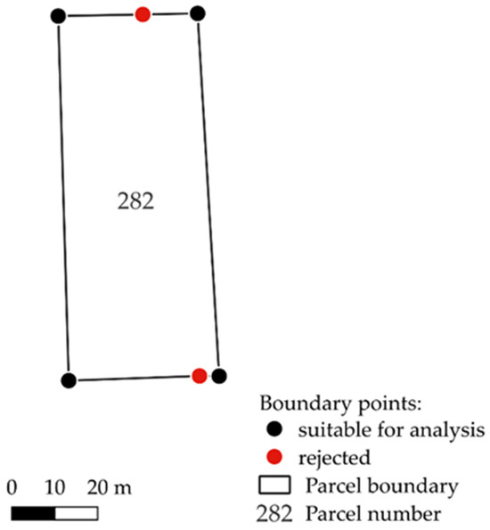The modified index is based on an analysis of the standard deviation of the distance between the vertices of a polygon and its geometric centre. This approach provides a relatively reliable assessment of the shape’s regularity. Exceptions are vertices situated on a straight line traced by adjacent points, or at a negligible distance from this straight line. Such vertices are of minimal relevance to parcel shape characteristics; however, they affect the index value. To solve this problem, vertices were excluded from the analysis (rejected) if the corresponding interior angles of the polygon had measures in the range of 170° to 190°. A case example is shown in Figure 5.