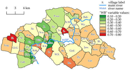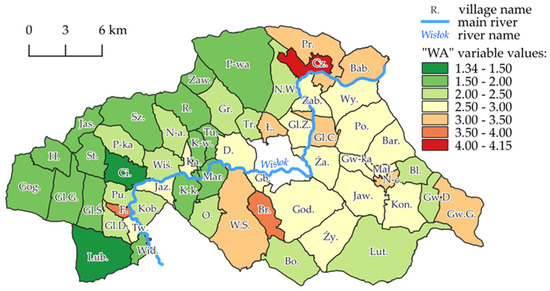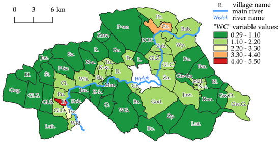 Determining the number of potential land consolidation participants requires compiling a list of landowners for each surveyed locality. As the data on the land and its owners are stored in a relational database that maintains unique identifiers for each object, retrieving the desired information is possible using a dedicated SQL query. Next, indicator WC was calculated using the following formula: