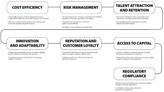 According to studies by Talan and Sharma [27], the integration of ESG factors is the most sustainable investment strategy used in the United States, Oceania, and Asia. A study by Alsayegh et al. [28] showed that ESG practices disclosed by companies in Asia strengthened corporate sustainability performance. The authors of [28] explained that providing quality ESG information increases the trust between agents and, consequently, the company’s performance, as also identified by the studies by Benkraiem et al. [29] and Piechocka-Kalunna et al. [25], which indicated that the correct disclosure of ESG practices can generate positive returns for an organization, as it implies the possibility of raising capital at a lower cost, inducing a better financial result. Figure 1 shows the exact connections between ESG performance and operational performance.