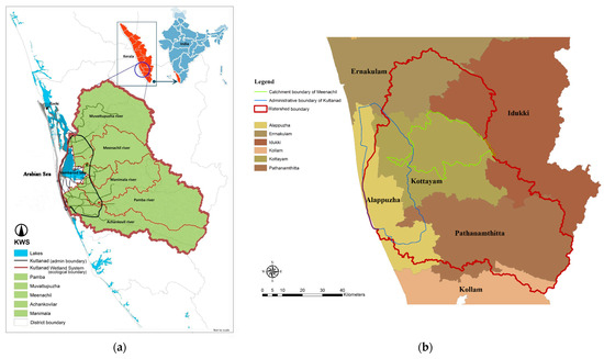 Geographical and administrative boundaries related to the Kuttanad Wetland System: (a) the Kuttanad administrative area and the five main river catchments that flow into the Kuttanad Wetland System (Source: Sonu, T.S., 2022 [16]); (b) the Kuttanad administrative boundary with the district boundaries and the Meenachil catchment boundary.