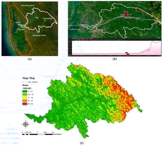 Hydrological characteristics of the Meenachil River Basin: (a) The catchment boundary of the Meenachil river basin and how it adjoins the Kuttanad administrative area with the rain gauge stations and discharge station within the basin; (b) sectional elevation of the watershed from Google Earth; and (c) river network with the degree of slope of the basin area.