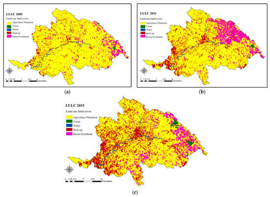 Land use and land cover changes over time: (a) LULC map for 2005; (b) LULC map for 2011; and (c) LULC map for 2015.