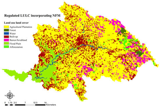 The NBS or regulated scenario considered two changes to the LULC maps with the aim of reducing flooding. Firstly, this was considered for the upper part of the catchment, where 21.3 km2 of mostly scrubland was converted to forest cover (Table 2 and Figure 4). This used the standard forest parameters. Secondly, in the floodplain by the conversion of 82.0 km2 to a wet meadow class where perennial grasses comprise more than 10 percent of the vegetation cover [64]. This was restored in order to increase the water holding capacity, allowing flood waters to spread over a larger region [16]. A very low value for the Strickler coefficient was used, increasing the roughness to reduce overland flow. The results of the SHETRAN simulation with the NBS LULC maps were fed through the HEC-RAS model and the results were compared to the LULC 2015 simulations.