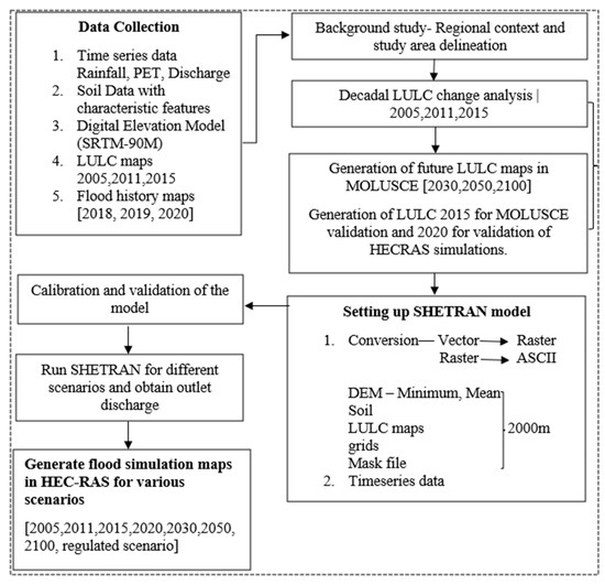 The overall methodology in the work can be seen in Figure 5. This started with data collection, then the analysis of the current LULC maps, the development of the future LULC maps, the hydrological simulation using SHETRAN, and the hydraulic simulation using HEC-RAS.