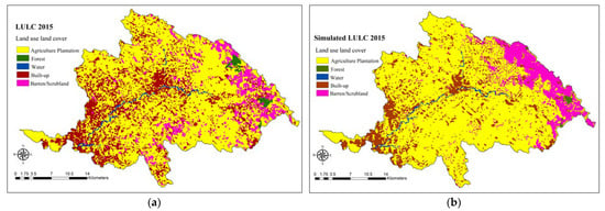 Comparison of LULC maps for 2015: (a) reference LULC map 2015; (b) simulated LULC map 2015 using MOLUSCE.
