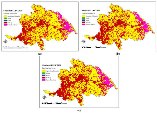 Projected LULC changes: (a) simulated LULC map for 2030; (b) simulated LULC map for 2050; and (c) simulated LULC map for 2100.