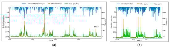 Comparison of observed and simulated flow with rainfall data: (a) rainfall, observed, and simulated flow for part of the calibration period, 2000–2003, (b) observed and simulated flow for part of the validation period, 2010–2012.