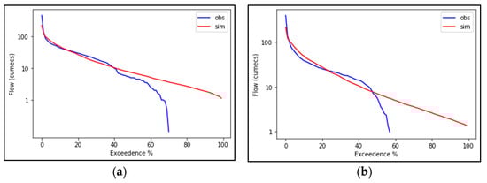 The calibration runs are shown in the Appendix. The best calibration simulation produces an NSE of 0.63, PBIAS = 1.80, and KGE = 0.75 for daily discharges with the validation giving an NSE of 0.56, PBIAS = 5.60, and KGE = 0.72. The comparison between the measured and simulated discharge for four years in the calibration period and three years in the simulation period can be seen in Figure 8a,b. Overall, the quality of the simulations is considered to be fair to good [59,65]. The main issue with the simulation is having only two rain gauges over the entire 854 km2 catchment, which is insufficient to capture many of the highly localized convective rainfall events that occur in tropical regions [66]. This means some of the extreme rainfall events, such as in June 2001, which produced a peak discharge of 450 m3/s, are not captured by the simulation which has a peak value of 200 m3/s. Whereas, for other events, such as in October 2002 the simulated discharge is 150 m3/s, which is higher than the measured discharge of 50 m3/s. The other main issue in the simulations is that the discharges simulated during the dry season are too high, this can clearly be seen in the flow duration curves (Figure 9a,b). There may be some issues with the observed data here as the observed flows are often zero during these periods whereas the river is known to be perennial. As this work considers flooding, this issue will not significantly affect the results.
