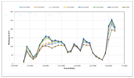 The simulated outlet discharge from the simulations for the seven different LULC simulations using rainfall and PET data for the period from June to November 2000 can be seen in Table 4. There is a clear pattern of increasing flow from 2005 to 2100 as the urban fraction within the catchment increases. Figure 10 considers the simulated discharges from June 2000 in detail. There is again a clear pattern of increasing discharge from 2005 to 2100 as the urban fraction increases. For instance, there is an increase of 8.5% in the average discharge in the month of August from 2005 to 2100. What is also clear is a higher absolute and relative difference in discharges for the larger discharges, such as for the rainfall event on 8 June 2000. Whereas, for low flow periods, such as on 26 June 2000, very similar flows are simulated for whichever LULC map is used. The bigger differences at high flows feed into the HEC-RAS model and produce a significant difference in the flooding downstream.