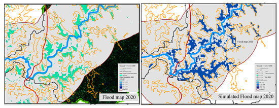 Validation of the HEC-RAS simulated flood inundation map against the reference flood history map of 2020. This shows the main river channel and the simulated 4 km buffer.