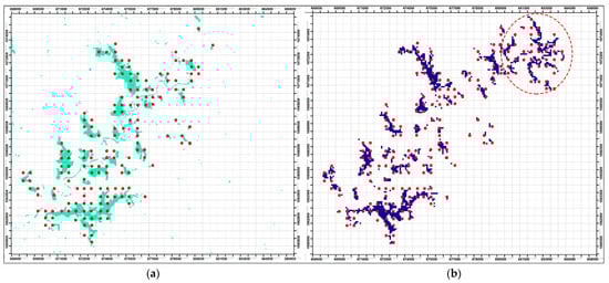 Grid analysis of the 2020 flooding event: (a) observed and (b) simulated grid analysis for the 2020 flooding event. The dots show cells that exhibit flooding. The highlighted area shows the approximate location where the observed and simulated events are most different.