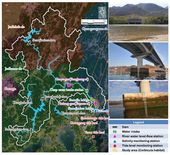 The Seomjin River basin, in the central-western region of the southern coast of South Korea, is one of the five major river basins in South Korea. Geographically, it is situated between east longitude 126°51′50″~127°53′05″ and north latitude 34°40′26″~35°50′0″. The Seomjin River basin spans 4913.22 km2 in area, with a river length of 222.14 km. The mean elevation is recorded at EL. 301.58 m [8] (Figure 1). The land use distribution comprises 876.29 km2 of arable land, 3400.61 km2 of forested area, 67.12 km2 of developed land, and other areas totaling 567.86 km2, with approximately 69.2% of the total watershed area consisting of forested land [10]. Key facilities such as the Seomjin Dam and the Juam Dam on the Boseong River are strategically located upstream of Seomjin River’s main stream. Due to the expansion of the Seomjin Dam in 1965 and the completion of the Juam Dam in 1992, downstream sulfur fluctuations and reduced discharge have occurred, primarily to supply a substantial amount of water outside the watershed in line with the government’s economic development plan. Concurrently, various impacts, such as sand mining and landfilling in estuaries, have led to the influx of saline water into upstream estuaries, causing long-term ecological changes in watersheds [10].
