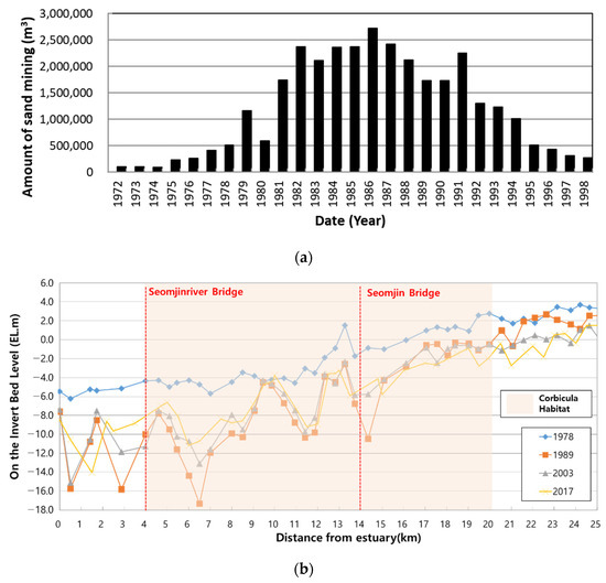 Graphs of environmental change data over the past 40 years. (a) The annual quantity of sand mining in the Seomjin River basin from 1972 to 1998, (b) Changes in the riverbed level over the past 40 years.