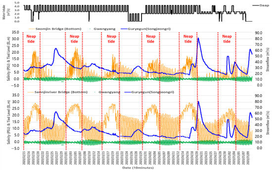 In this section, we focused on the measured data required for the calibration of the EFDC model, as shown in Figure 3. In this study, our goal was to measure salinity in the Seomjin River estuary and explore its correlation with factors such as river discharge, riverbed change, and tidal level. To achieve this goal, fixed salinity gauges were installed at two locations (Seomjin Bridge and Seomjin River Bridge) to construct a time-series dataset of salinity concentrations (Figure 1). Fixed salinity gauges, which have been operational since 15 February 2020, were installed at three intervals (upper, middle, and bottom) at each location on the riverbed, and the salinity was monitored continuously. The salinity data utilized the lower layer (bottom) data from the Seomjin River Bridge and Seomjin River Grand Bridge, considering density current measurements. The salinity range at Seomjin Bridge was 0.0 to 23.8 psu, with an average of 3.3 psu. The salinity of the Seomjin River Bridge ranged from 0.0 to 29.7 psu, with an average of 14.3 psu. Typically, the average salinity of seawater is defined as more than 30 psu [18]. Thus, during neap tides, the Seomjin River Bridge experienced river water transformation into seawater, maintaining a high salinity concentration, which was influenced by tidal variations from EL.m −2.36 to EL.m 2.0 at the Gwangyang station. The stream flow in Guryegun (Songjeongri) varied according to precipitation and increased with rainfall. In the absence of rainfall, it was maintained between a minimum of 17 and 20 m3/s, including artificial dam supply.