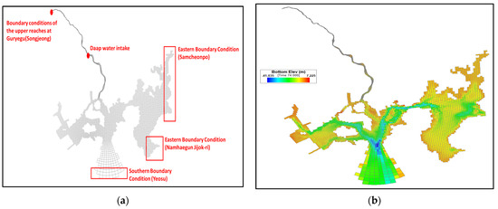 Setup for the EFDC model in this study. (a) Grid composition; (b) Sea elevation distribution map.