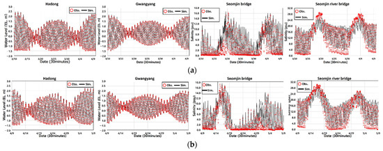 Comparison graphs of the observed and simulated results: water levels of the Hadong River and the Gwangyang River and salinities of the Seomjin Bridge and the Seomjin River Bridge. (a) Calibration. (b) Validation.