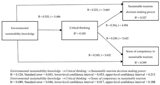 The unstandardized beta (B) values (two-tailed test) were reported. Hypothesis 1 suggested that environmental sustainability knowledge was positively related to critical thinking. This hypothesis was corroborated since an increase in environmental sustainability knowledge positively influenced critical thinking (B = 0.355, standard error = 0.065, t = 5.486). Hypothesis 2 predicted that environmental sustainability knowledge was positively related to sustainable tourism decision-making power. Hypothesis 2 was supported because environmental sustainability knowledge significantly amplified sustainable tourism decision-making power (B = 0.221, standard error = 0.060, t = 3.669). The findings stated that environmental sustainability knowledge was also positively related to a sense of competency in sustainable tourism (B = 0.379, standard error = 0.058, t = 6.492). Hypothesis 3 was confirmed. As depicted in Figure 2, critical thinking was positively linked to sustainable tourism decision-making power (B = 0.354, standard error = 0.071, t = 4.994, hypothesis 4) and sense of competency in sustainable tourism (B = 0.249, standard error = 0.069, t = 3.632, hypothesis 5). Hence, hypotheses 4 and 5 were supported.