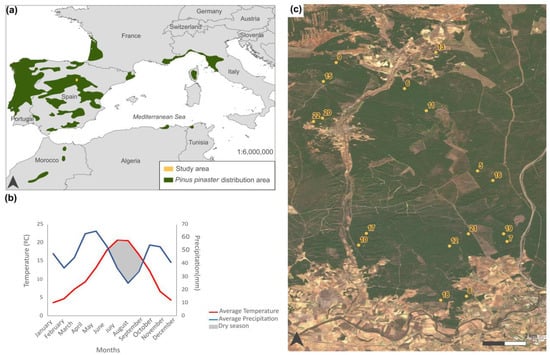 Characterization of the study area: (a) distribution of Pinus pinaster in Southern Europe and Northern Africa and location of our study area, (b) climatic characterization of the study area through mean temperature and precipitation, and (c) recent orthophotography of the area where the plots are located, with their corresponding enumeration.