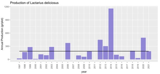 During the collection period (1997–2021) a total of 82,522 kg of Lactarius deliciosus were collected. A database of annual mushroom production values at the plot level recorded yields within the plot, indicating species, number of individuals and biomass per species, collected weekly. In 2014, the highest production was recorded, whereas in 2004, 2005, 2007, and 2017, there was no production detected (see Figure 2). During this period there was an average total production of Lactarius deliciosus of 187 g/year per plot. Although there were no production values in 4 of the 25 years analyzed, the annual variability of production (on a logarithmic scale to avoid the effect of these zeros) was quite similar in the different plots (Figure 3).