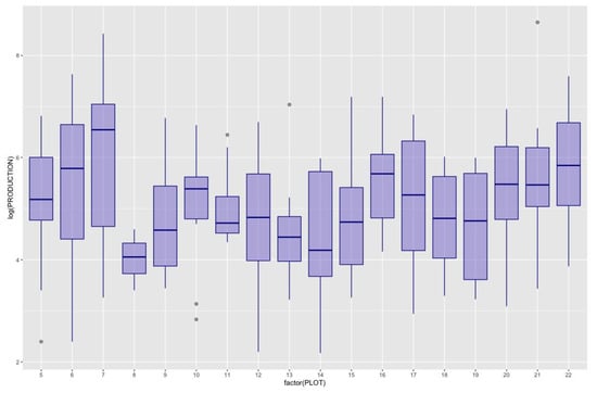 Box Plot of Lactarius deliciosus production across plots over the time series. Each box plot encapsulates the annual production for a specific plot, with Plot 7 exhibiting the highest production and Plot 8 showing the lowest. To enhance visualization and mitigate the impact of years with no production or excessive yields, the total production values (originally in g) have been log-transformed.