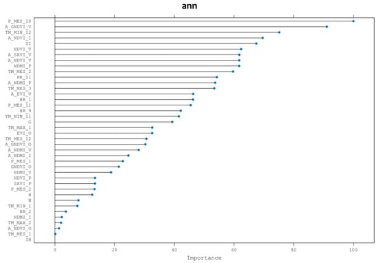 While rpart provided a sorted list of variables based on their relevance, this was primarily for computational efficiency and to exclude variables expected to be insignificantly important. Thus, after completing the analysis, and employing the chosen ANN algorithm, Figure 4 illustrates the prioritization of variables by their importance. The results significantly differ from those obtained through rpart variable selection. In this context, the most influential variables are climatic, particularly the average precipitation in October (P_MONTH_10), succeeded by spectral indices like summer GNDVI of the previous year, December minimum temperature, winter NDVI of the previous year, and site index (stand forest potential productivity).