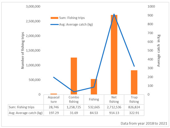 Data on nearshore fishing activity spanning from 2018 to 2021 have been comprehensively compiled, comprising five primary categories with a total of 54 sub-categories. Each sub-category has been detailed with the corresponding number of fishing trips and the average catch per trip, as presented in Table 2, which illustrates the results of this statistical inquiry. It should be noticed that all fishery data collected represent the summation of fishing activities conducted within a 30 km radius of each monitoring site.