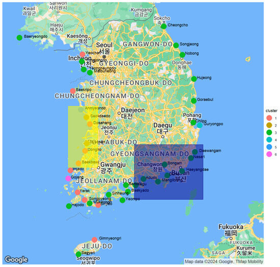 The coastal monitoring sites selected for analysis in the southwest sea area are six in total. Sites not clustered with cluster 1 were included due to their close geographical proximity, ensuring a sufficient number of data points.
