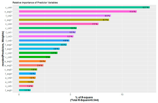Variable selection across different time lags revealed that variables of the 2nd and 3rd lags had the highest representation, each with five independent variables. The relative importance showed that the 4th lag variable, c_cnt4 (representing the number of combo fishing trips), had the highest importance at 12.7%, while the 0th lag variable, f_avg0 (indicating the average catch in line fishing), had the lowest relative importance at 1.1%.