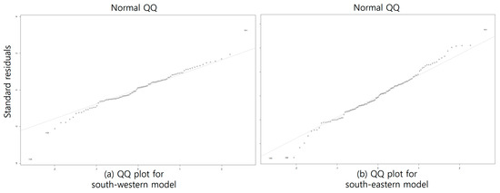 Figure 5 presents the quantile–quantile (QQ) plot results for the proposed time series regression models. Although some outliers were found in the tails, most of the data align closely with the diagonal line.