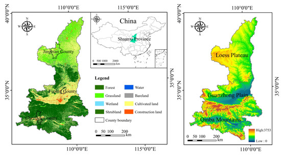 This study selected Jingbian County, Fuping County, and Chenggu County in the Shaanxi Province as representative research areas, each epitomizing a distinct region within the province’s three major geomorphic types: the Loess Plateau in the north, the Guanzhong Plain in the center, and the Qinba Mountains in the south. Jingbian County, situated in the northern part of Shaanxi Province, serves as a microcosm of the Loess Plateau geomorphology, characterized by deep loess deposits and a landscape marked by an intricate network of gullies and ravines. This region is ecologically fragile and faces severe soil erosion challenges. Simultaneously, due to its abundant energy resources, it primarily relies on the energy industry for economic growth. Fuping County, located in the Guanzhong Plain region of central Shaanxi, boasts fertile land and a humid climate, making it a crucial agricultural production base not only for the province but also nationally. In addition to agriculture, the county has developed a diversified industrial structure encompassing manufacturing, modern services, and high-tech industries. Chenggu County, located in the Qinba Mountains, boasts a diverse ecosystem, abundant natural resources, and considerable potential for eco-tourism development. The intricate topography and diverse ecosystem types found in the Qinba Mountains are of great significance in maintaining regional carbon balance. The locations of these study areas are depicted in Figure 1.