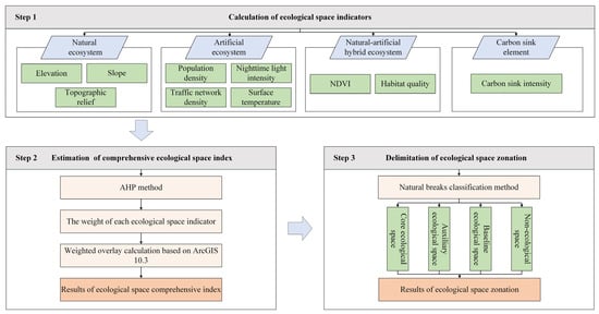 Building upon our previously established ecological space identification system for dual carbon targets [41], this study further refined and presented a comprehensive recognition model for ecological space (Figure 2). The realization process of the model was segmented into three primary steps. In the initial step, ecological space indicators were computed. Commencing from the inherent functions of urban ecological patches and considering the mutual interactions between patches and the surrounding landscape environment, while also incorporating the carbon sink capacity of the ecological space, this study established ten indicators. The second step involved estimating the ecological space comprehensive index. The analytic hierarchy process (AHP) method was applied to determine the weights of different ecological spatial indicators. Subsequently, spatially weighted overlay analysis was conducted using ArcGIS 10.3 software to derive the ecological space comprehensive index. Finally, in the third step, the delineation of ecological space zones was executed. Drawing on existing research findings on ecological space partitioning [42], this study categorized ecological space into four types using the natural breakpoint method.