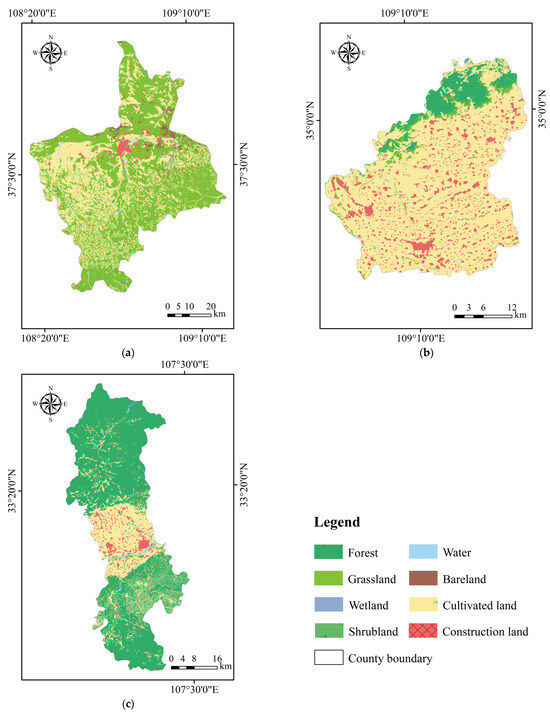 The distribution pattern of land use. (a) Jingbian County. (b) Fuping County. (c) Chenggu County.