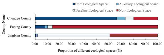 In contrast, Fuping County was characterized by the dominance of non-ecological spaces, constituting up to 85.93% of the area, illustrating a county with high population density and intensive land use. Situated in the Guanzhong Plain, the county is characterized by flat terrain, convenient transportation, and frequent socio-economic activities, thereby experiencing significant human impacts. Despite having a modest proportion of core ecological spaces (8.03%) and a limited quantity of auxiliary and baseline ecological spaces (2.02% and 4.02%, respectively), the overall pressure on ecological conservation was substantial. This necessitates heightened attention to regional protection and restoration efforts in future ecological planning and management, aiming to strike a balance between human activities and ecological conservation (Figure 5).