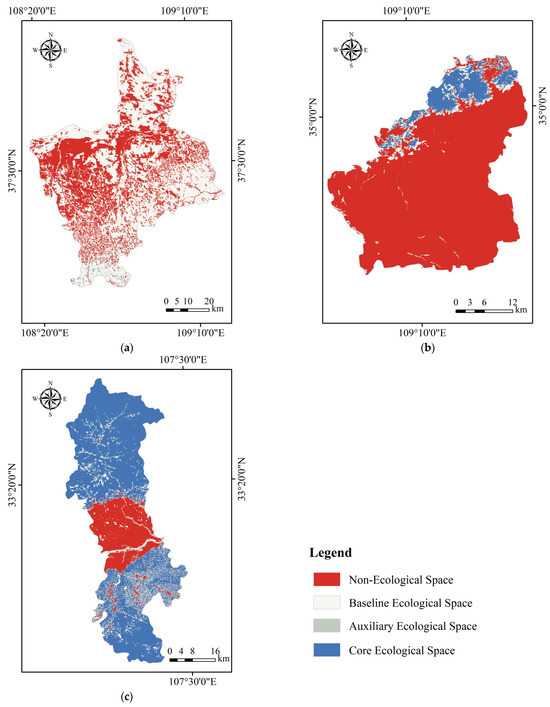 Distribution patterns of ecological spaces in counties with different landform types. (a) Jingbian County. (b) Fuping County. (c) Chenggu County.