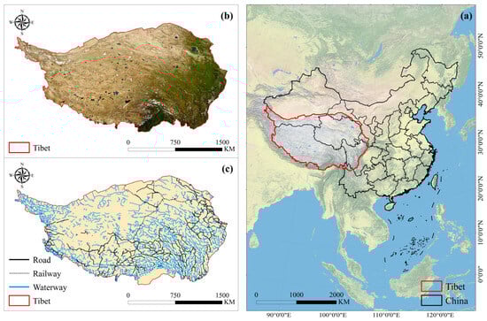 (a) Geographical location of the Tibetan Plateau; (b) Raw remote sensing imagery of the Tibetan Plateau; (c) Distribution of road, railway, and waterway on the Tibetan Plateau.