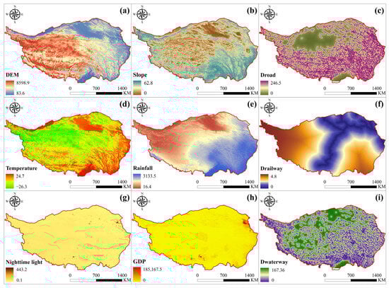 Drivers of the Tibetan Plateau in the PLUS model. (a) DEM; (b) Slope; (c) Distance to road; (d) Mean annual temperature; (e) Mean annual rainfall; (f) Distance to railway; (g) Nighttime light; (h) GDP; (i) Distance to waterway.